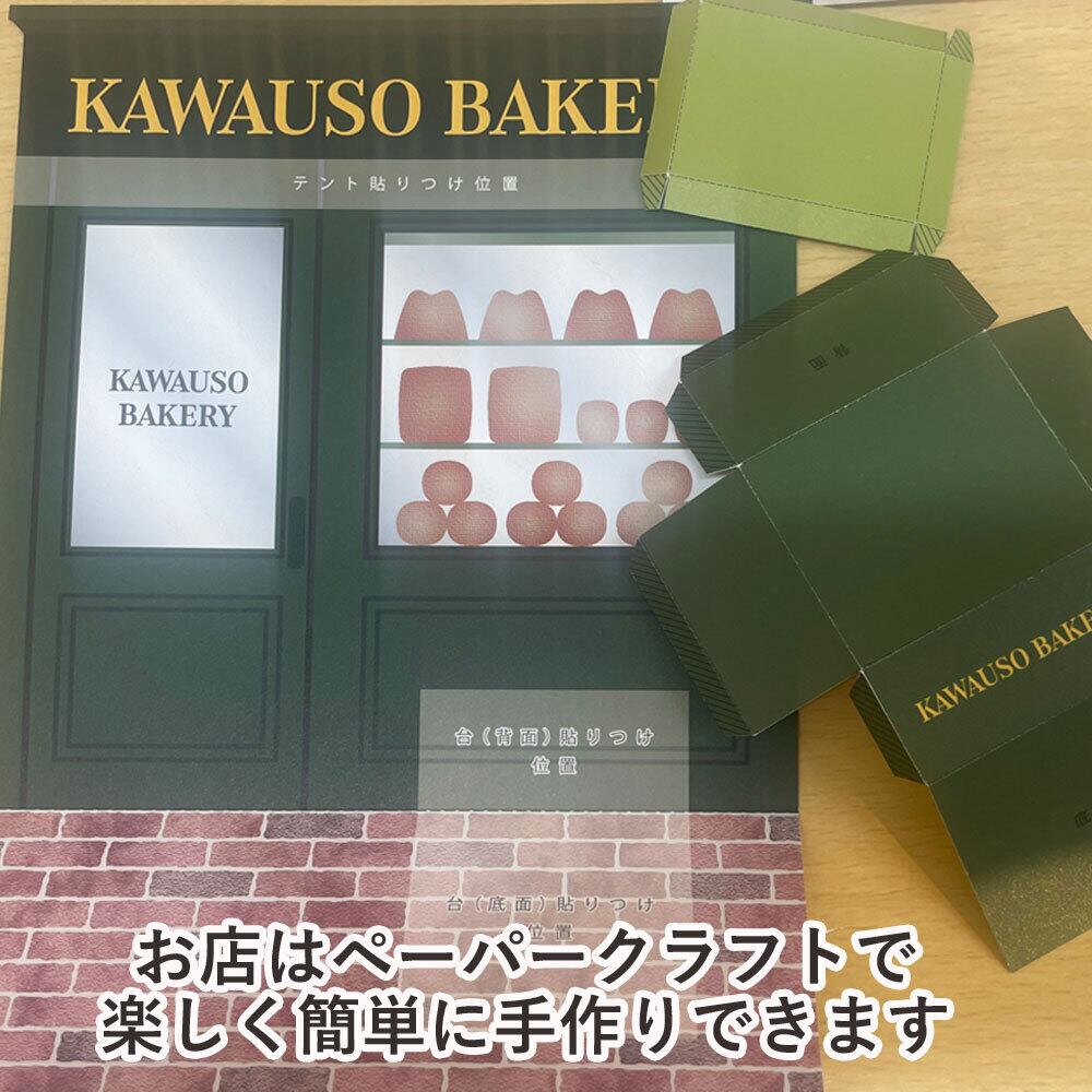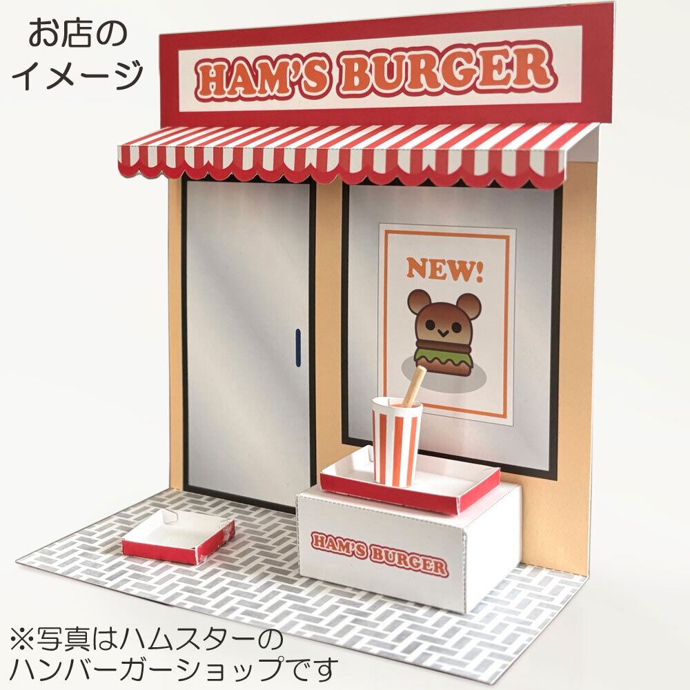 カワウソのパン屋さん、猫のドーナツ屋さん、ハムスターのハンバーガー屋さんの3ショップを工作して、小さな街を作りましょう。