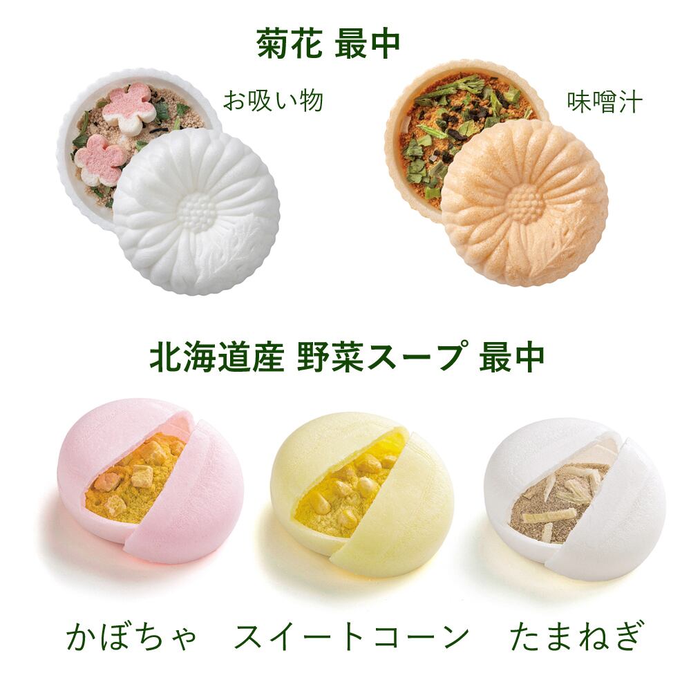 食卓がパッと華やぐ、おめでたい形のお味噌汁・お吸い物・スープ最中のセット。