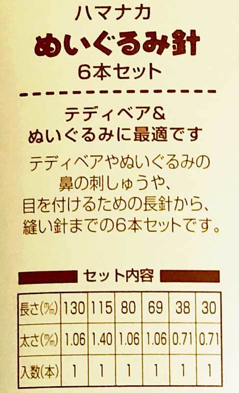 ぬいぐるみ製作用の使いやすい針、長短6本セット。