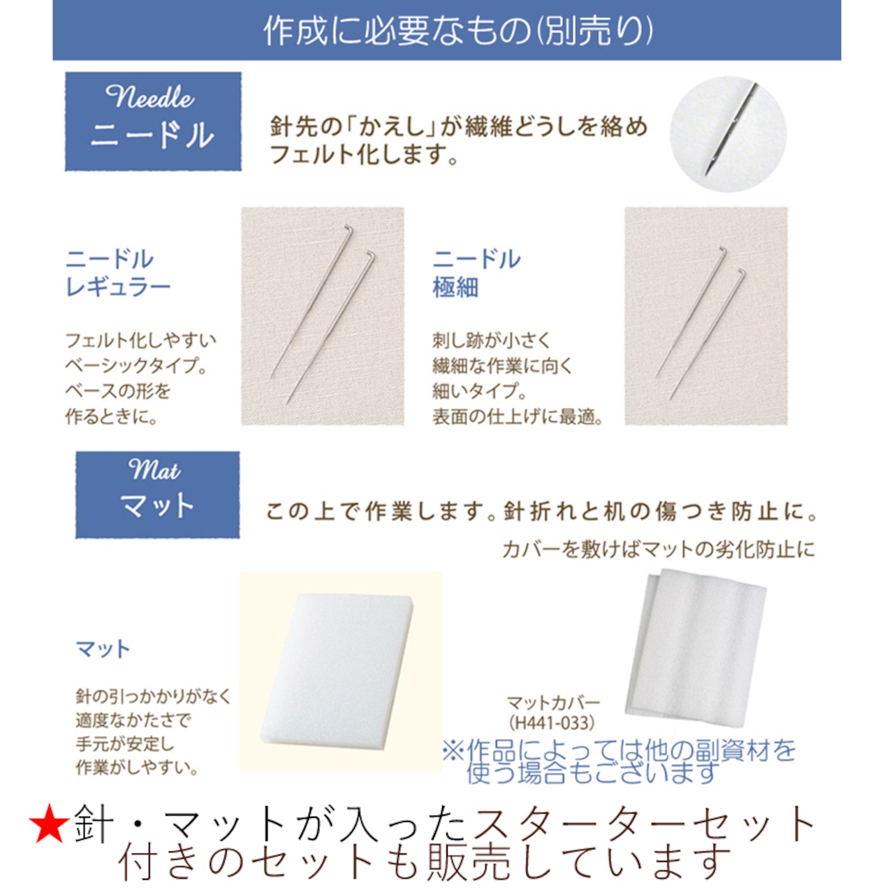 まとまりやすいニードル専用のアクリルファイバー「アクレーヌ」のフェルトを使っているので、お子様でも、初心者の方でも、簡単に手作りが楽しめます。