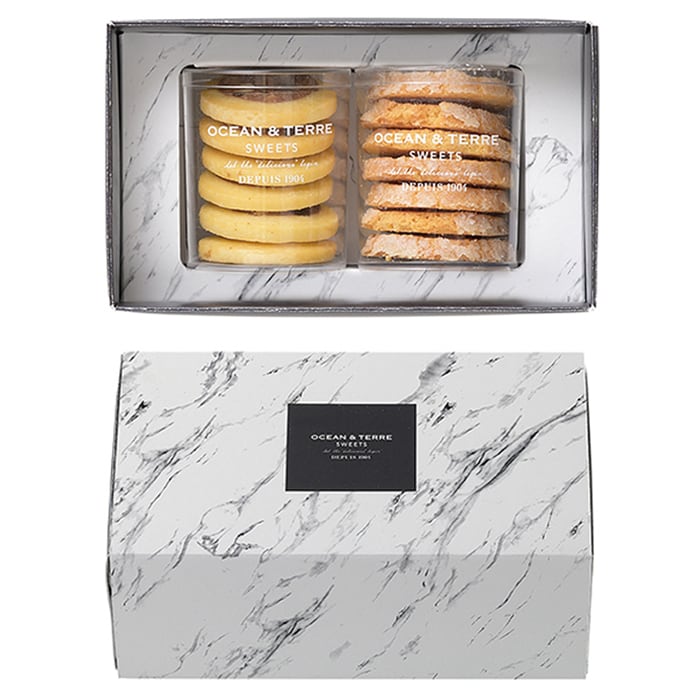 チョコチップとクルミが入ったココア生地と、プレーン生地の2層のバランスが良い「ケベック」と、フランス語で(ダイアモンド)という意味で、まわりの砂糖の甘みとザクザクした食感が味わえる「ディアマン」の、2種類の焼き菓子を各7枚ずつ詰め合わせました。