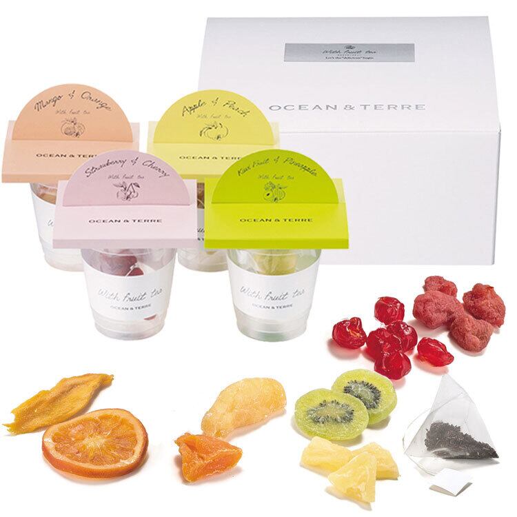厳選された素材を使用した本格的な味わいの彩り豊かなドライフルーツと、 「紅茶のシャンパン」と称される世界三大紅茶、ダージリンのティーバッグが入っています。