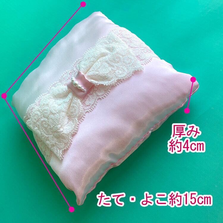 ふんわりサテン生地の艶やかなクッションとフェミニンなレースリボンのリングピロー。