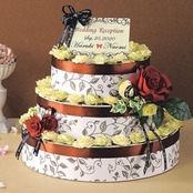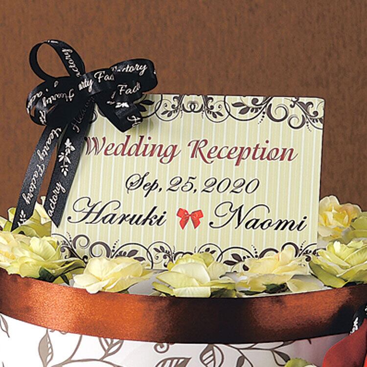 「レディーブラウン」3段のウェディングケーキ型ウェルカムボード(プチローズ付きホワイト苺チョコレートのプチギフト60個セット)