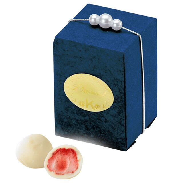 艶やかな三連パールのビーズが付いたプチギフトボックスは涼しい期間限定の甘酸っぱい苺チョコが入っています。