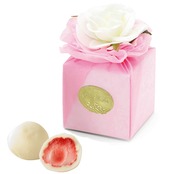 白いバラ付きの可愛いピンクのラッピングをしたボックスには期間限定のホワイトストロベリーチョコレートが2粒。