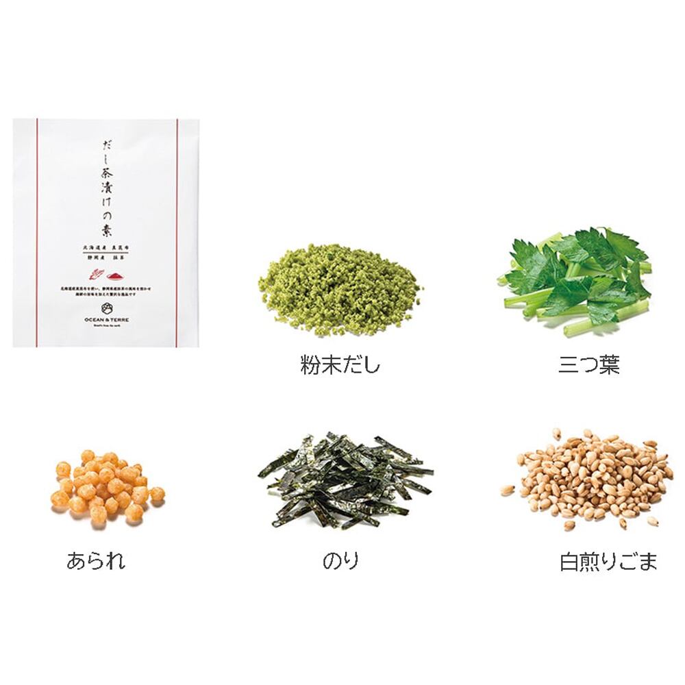 だし、三つ葉、あられ、のりがセットになったお茶漬けの素と白ごま、メイン素材をご飯の上にのせてお湯をそそぐだけで本格的な一品が完成。