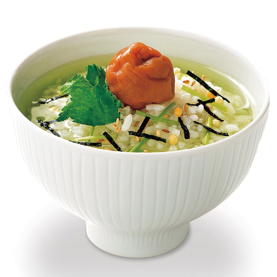 だし、三つ葉、あられ、のりがセットになったお茶漬けの素と白ごま、メイン素材をご飯の上にのせてお湯をそそぐだけで本格的な一品が完成。