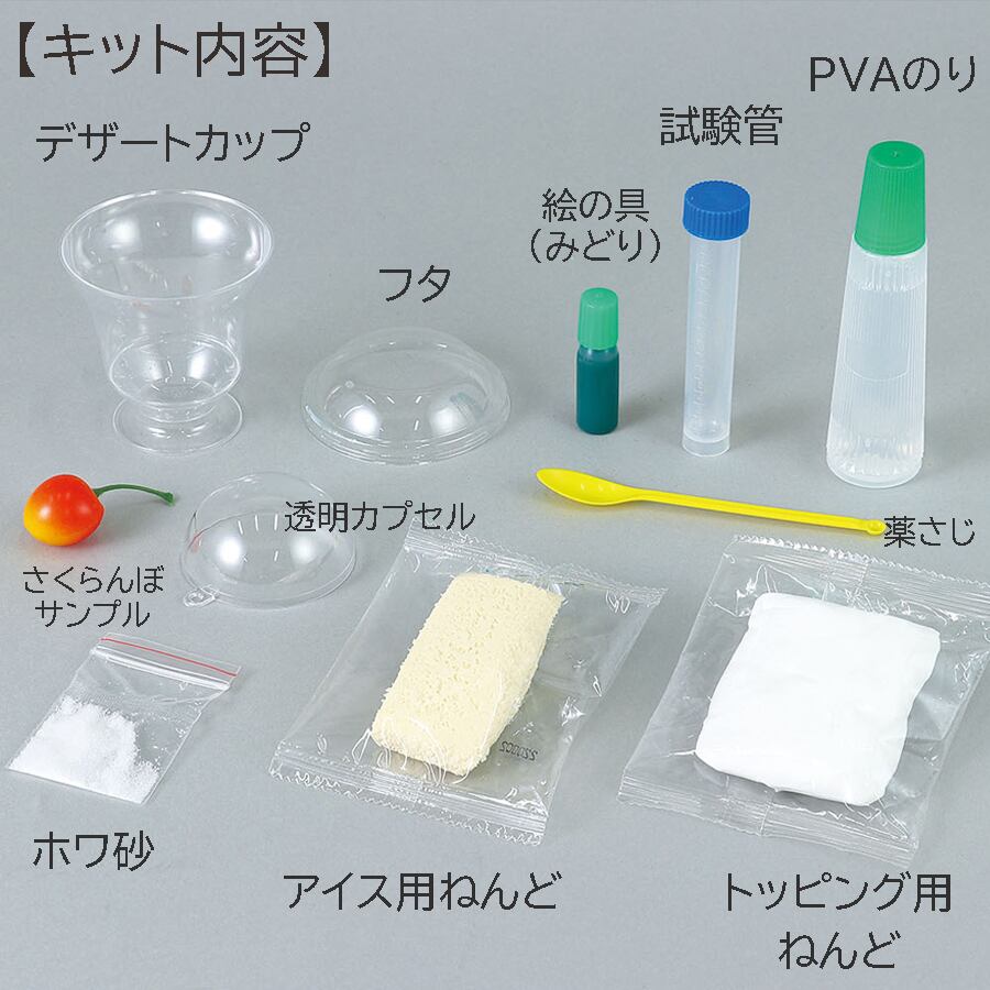 ◆セットの中身:デザートカップ、フタ、絵の具(緑)、試験管、PVAのり、透明カプセル、さくらんぼサンプル、薬さじ、ホワ砂、粘土(アイス用・トッピング用)