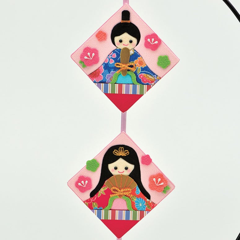「木目込み」で作るお雛様とお内裏様、菱餅のつるし雛のようなタペストリー。