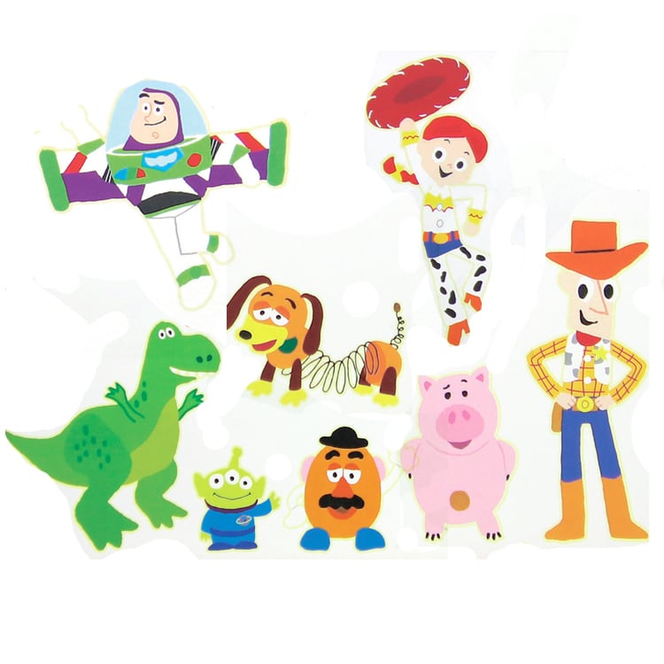 ウッディ、バズ・ライトイヤー、ジェシー、ハム、スキンリー・ドッグ、ミスターポテトヘッド、リトルグリーンメン、レックスがポップなタッチで描かれています。