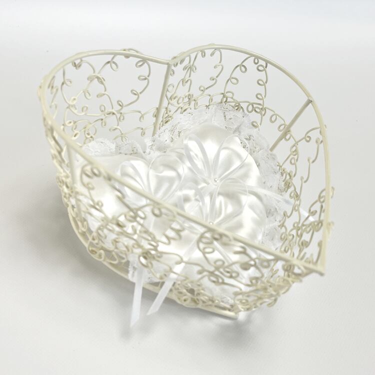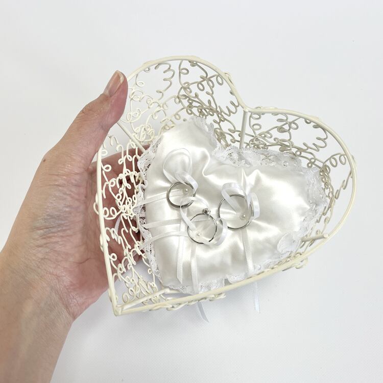 ワイヤー製のシンプルなハート型のバスケットなので、お二人らしくアレンジも可能。お花やリボンを飾ってオリジナルのリングピローにしましょう。