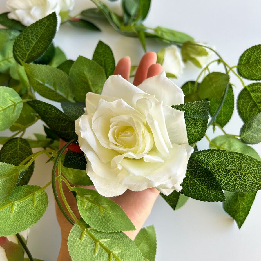 手軽に緑を取り入れられるホワイトローズとグリーンのガーランド。