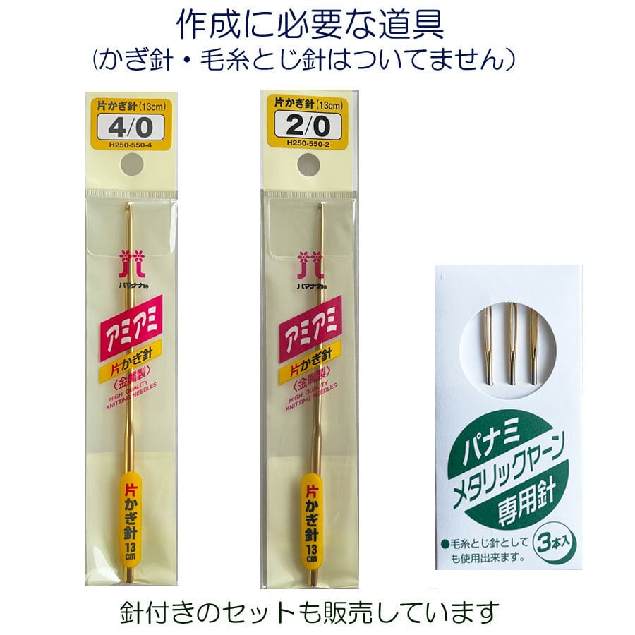 作成に必要なかぎ針、毛糸とじ針はついてません。