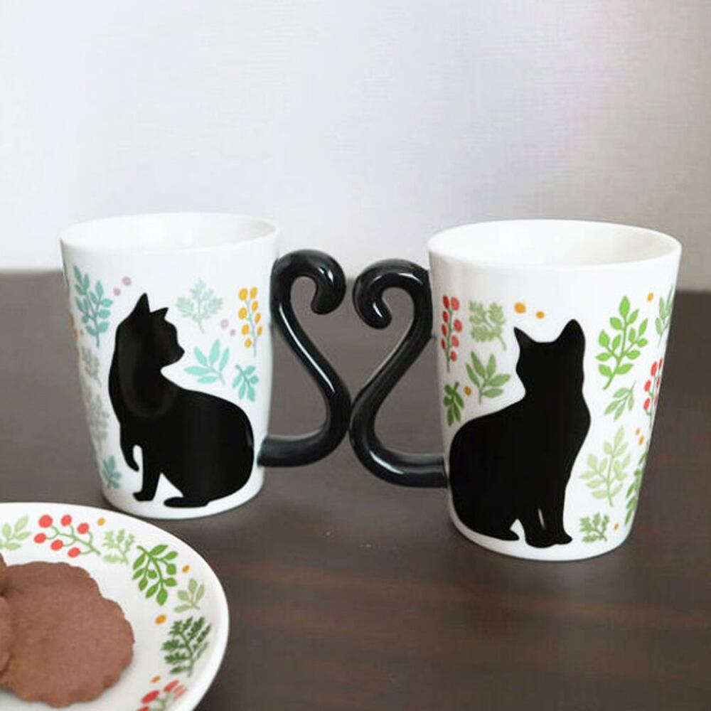 しっぽが取っ手になった黒猫のツインマグカップ。