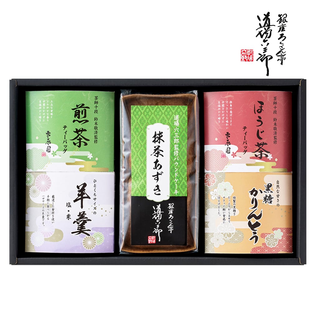 銀座ろくさん亭 道場六三郎 監修 抹茶あずきパウンドケーキ ギフトセット D パウンドケーキ 1本 煎茶 ティーバッグ 3袋 ほうじ茶 ティーバッグ 3袋 一口ようかん 4本 黒糖 かりんとう 20g ギフト包装 紙袋 熨斗 対応 焼き菓子 和風 スイーツ